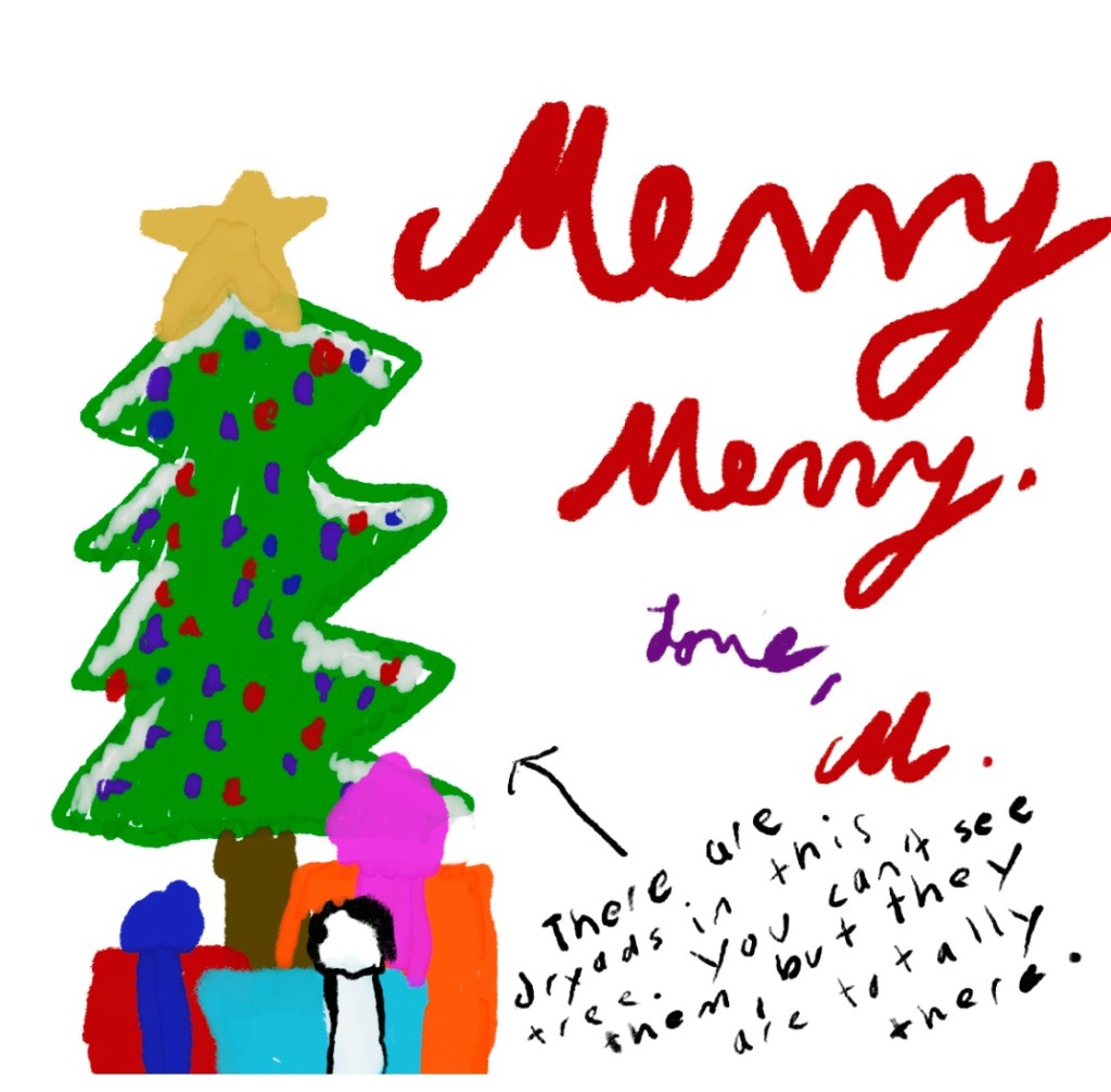 As a child of divorce, I had two of every holiday: two birthdays, two Thanksgivings, two Christmases… That’s sort of what being a current Pagan, benevolent ex-Christian is like. I’ll happily sing the Jesus songs and make a joyful noise about it, but I’ve also got my eyes peeled for nature spirits darting in and out of the branches of the Christmas tree—dryads playing chase-me!, chase-me! amidst the heraldic angels and holy dove ornaments.